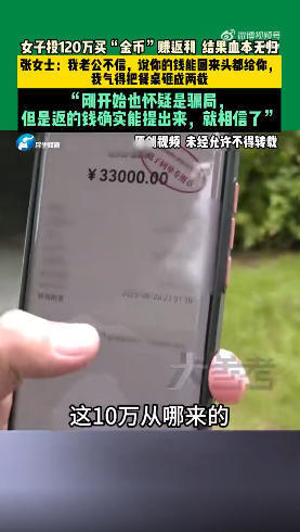 10月3日(采访),张女士(化名)经认识十几年的朋友介绍,想购买“金币”投资。因为缺少本金,找老公要钱却被拒绝,“这种高投资高回报全是骗人的,最后只会血本无归。”张女士十分生气,甚至将餐桌砸成两截,最终她老公同意了投资。